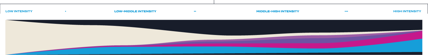 Our tiered design system moves like jazz, aligning visual expression with the emotional rhythm of the season. Low intensity sets a clean, composed baseline - steady, restrained, and professional. Low-middle introduces subtle movement and variation, beginning to build energy while maintaining control. Middle-high amplifies momentum through bolder rhythm and visual complexity, carrying the audience toward peak moments. High intensity marks the crescendo - unrestrained, electrifying, and reserved for moments that demand full attention and elicit powerful fan response.